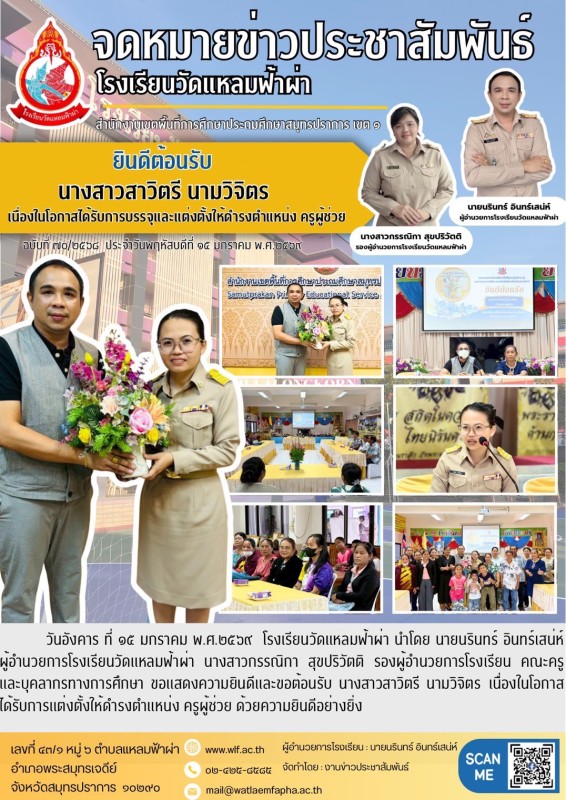ยินดีต้อนรับ นางสาวสาวิตรี นามวิจิตร เนื่องในโอกาสได้รับการบรรจุและแต่งตั้งให้ตําแหน่งครูผู้ช่วย
